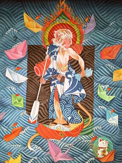 Combining a vibrant color palette and the delicate details of Japanese wood block prints, Moira Hahn's "Night of 1000 Fire Monkeys" dazzles in a fresh spin on Japanese printmaking inspired by Buddhist Hell scrolls. Hahn, who spent six months living in Japan watching the creation of wood block prints, has produced works in vivid watercolor that beautifully weave intricate Japanese imagery with touches of modern technology, humorous takes on today's society, and witty anthropomorphic creatures.