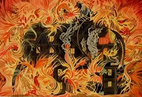 “Next Exit” is a visual explosion with a stylized flaming elephant. A vivid take on symbolic Buddhist Tibetan tanka painting, Hahn’s animated flames spiral and whirl, alive with mythical beasts and angry spirits. Our reading of the meaning of the flaming beast is as shifting as the flames. We note that the “elephant” is a wooden construction, with windows and orange barrels falling from one flank. Thoughts cascade around, suggesting everything from a Burning Man entertainment spectacle, to a Trojan horse, to an arsonist ignited warehouse. Then amidst the spiraling flames we notice the dark silhouetted figure of a man calmly digging for something on the beast’s back. His Texan hat and boots and the freeway-centric title lead us then to muse on automobile-wrought destruction, and the kinds of actions that fuel our blazing love of energy consumption and excess in general.